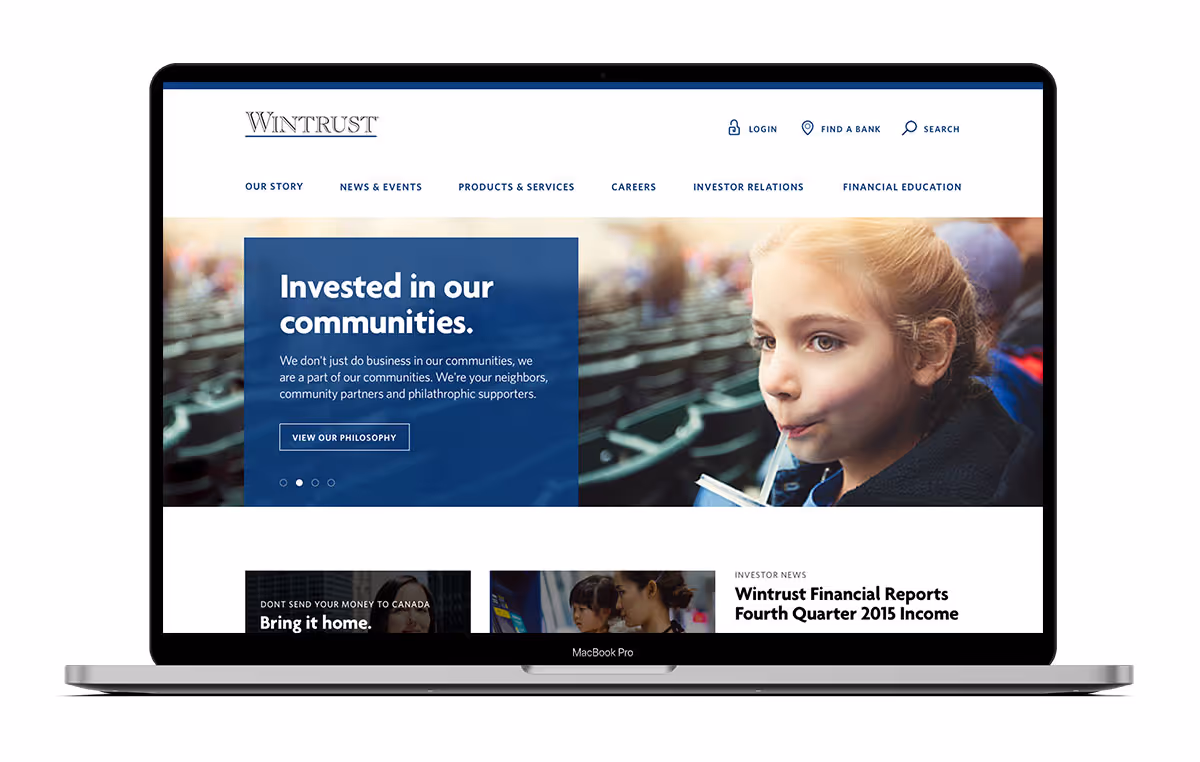 Wintrust is a financial holding company that operates 15 chartered community banks in northern Illinois and southern Wisconsin. Each community bank maintained its own unique brand and digital platform. Agency 39A developed a strategy for a customer experience that brought all 15 sites into a unified digital brand platform.