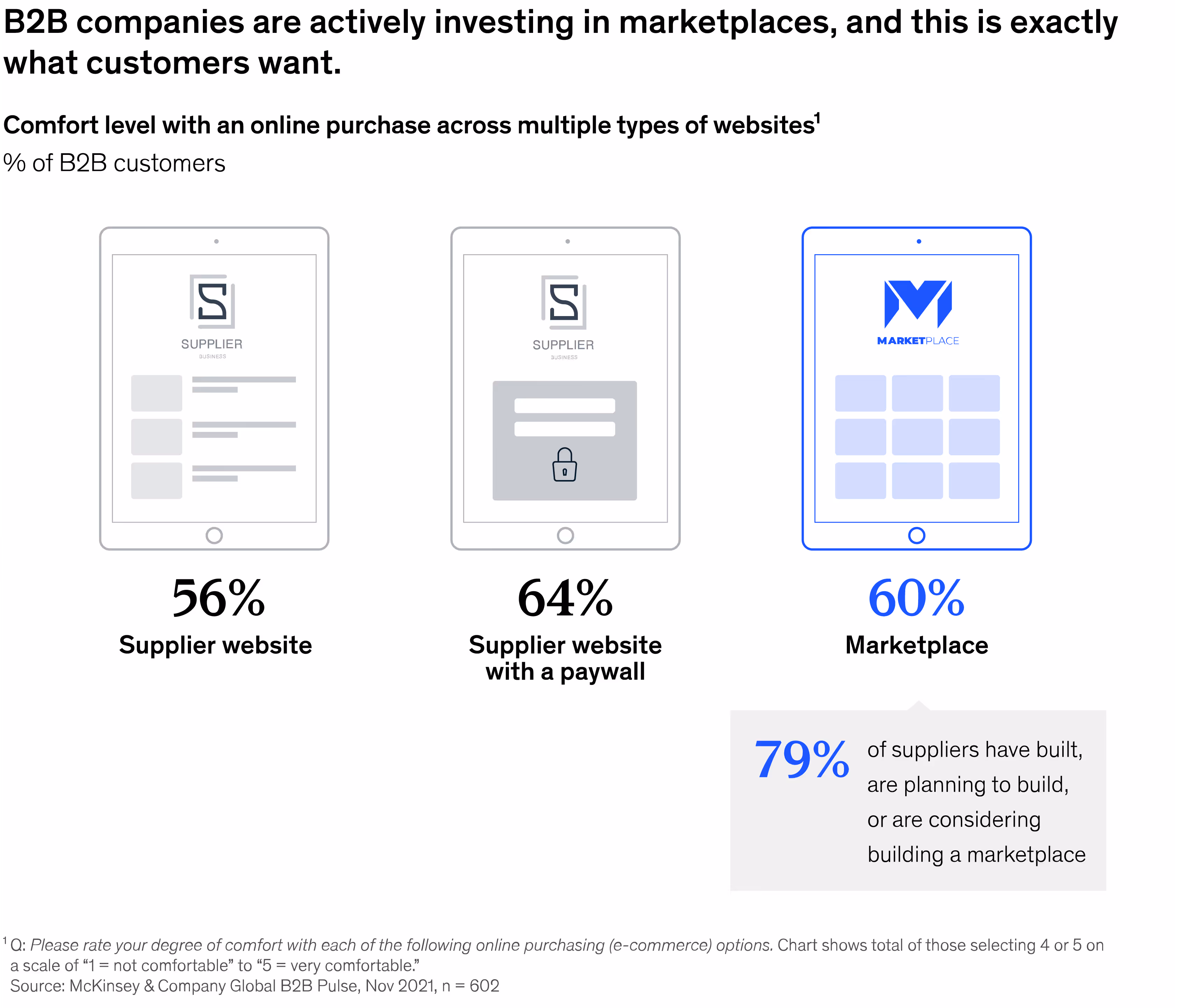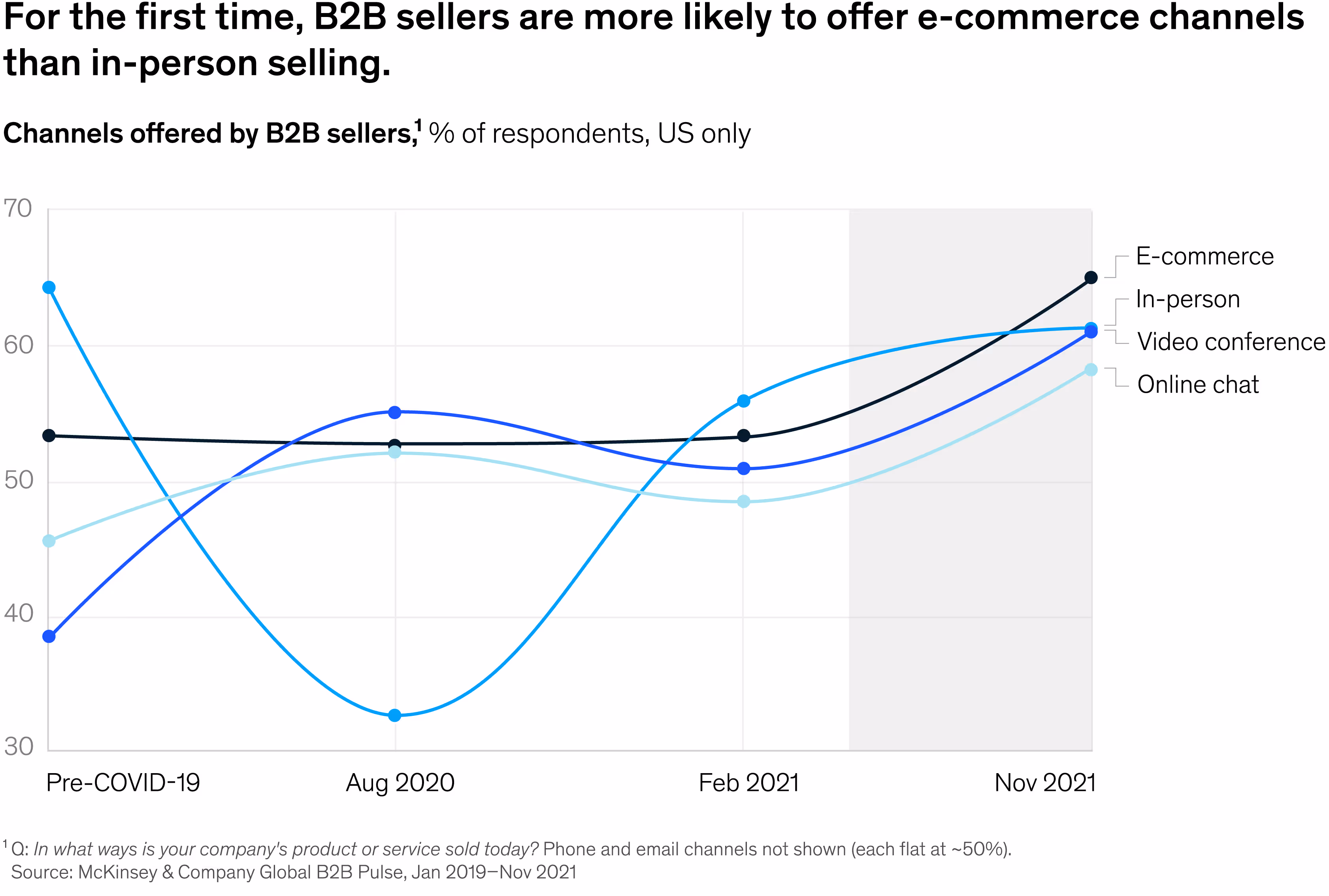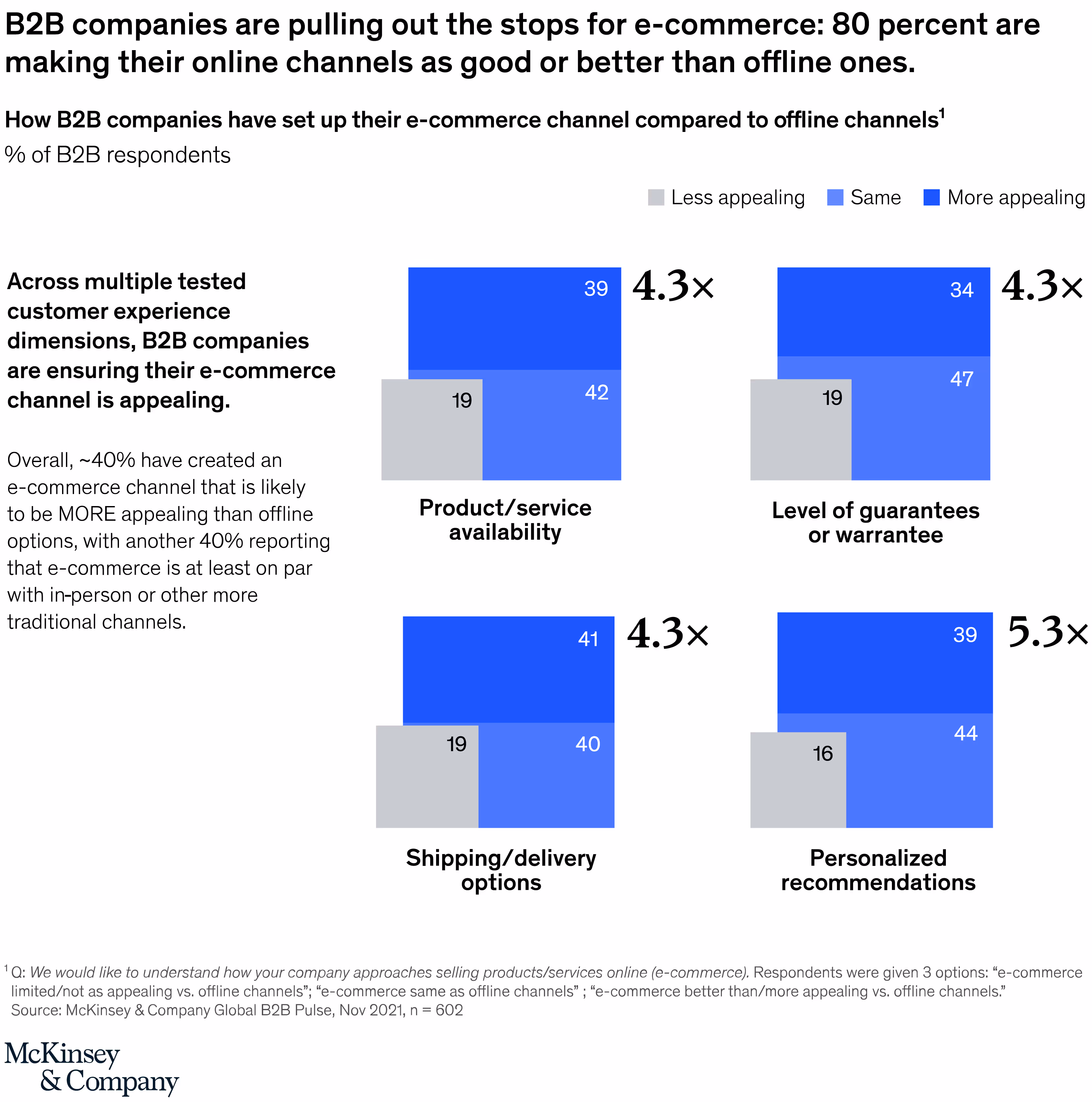 - Recognize e-commerce as an ecosystem play: leading B2Bs understand the importance of maximizing their online "surface area" to get in front of customers. To achieve a well-rounded e-commerce presence, it's important to have a specific marketplace and partner strategy in place.